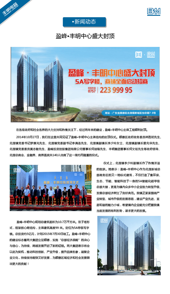 在各級政府及社會各界的大力支持和熱情關注下,經過兩年來的建設,盈峰·豐明中心盛大封頂